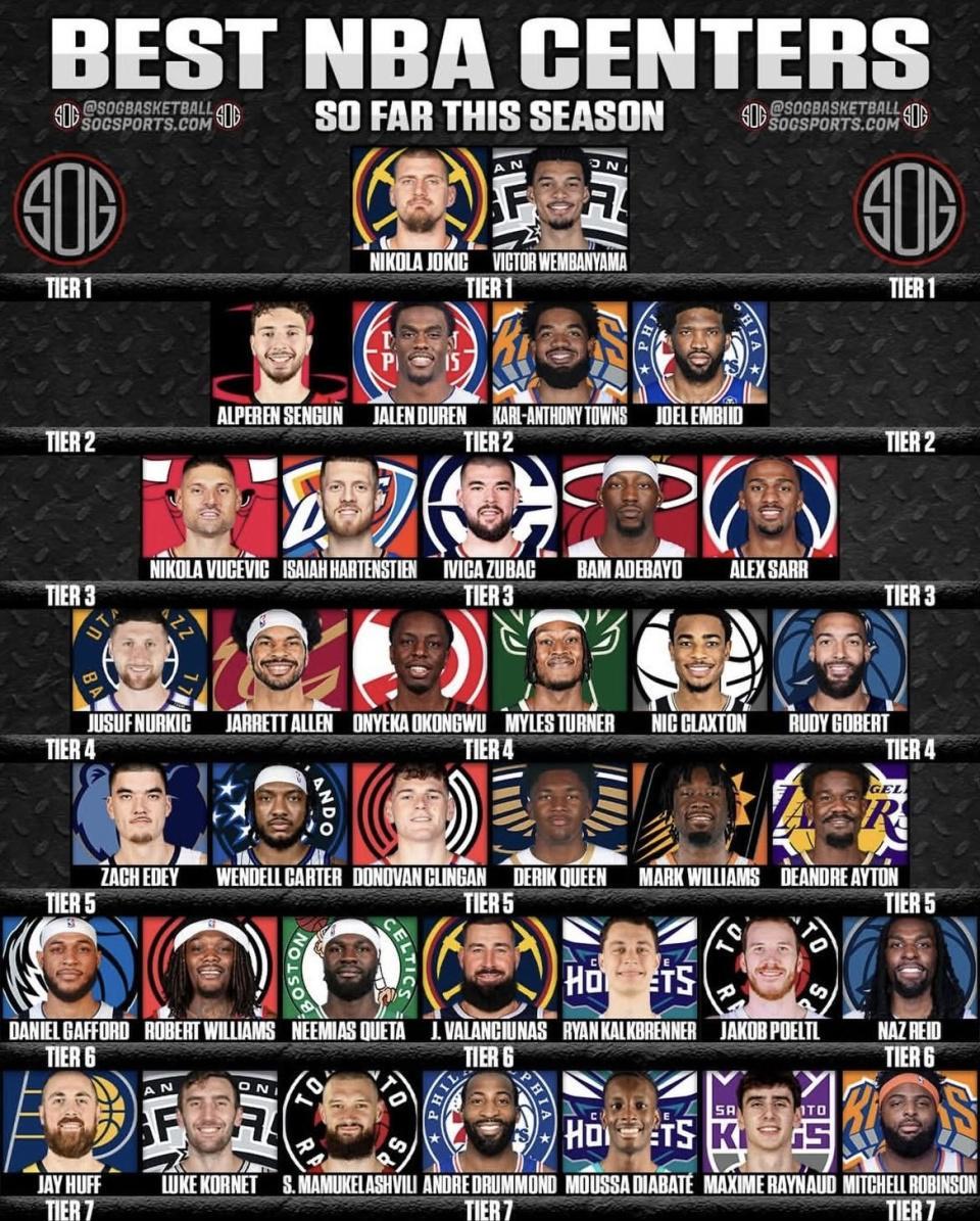 一档给到约基奇和文班亚马,逻辑很直白:约基奇本赛季场均29.6分、12.2篮板、11.0助攻,投篮命中率60.5%,这已经是“中锋身上打控卫体系”的顶配版本。 文班亚马则是另一种统治方式:场均24.2分、11.1篮板,投篮命中率50.6%,更关键是他把护筐和覆盖面积做成了球队防守的底盘。 这种层级的中锋,影响的不只是数据,而是比赛的默认剧本——对手从开场就得围着他改策略。